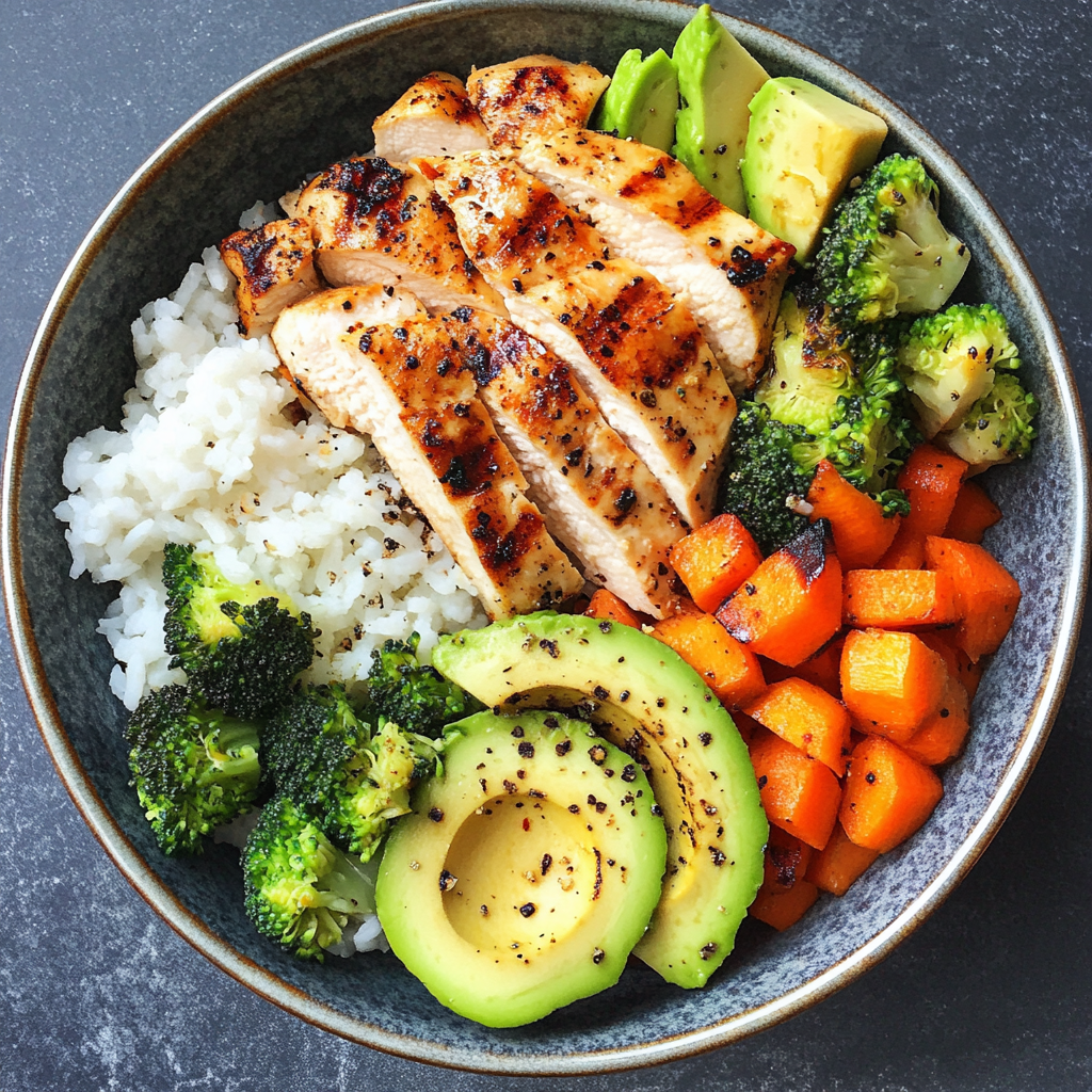 2. Top with grilled chicken pieces, steamed vegetables, and sliced avocado.