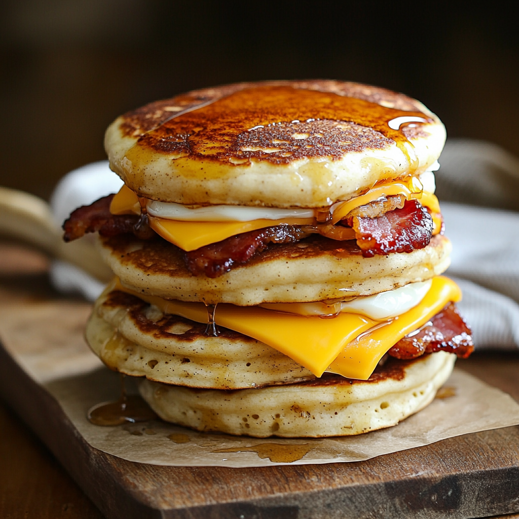 - Assemble by layering pancake, cheese, egg, protein of choice, and another pancake on top.