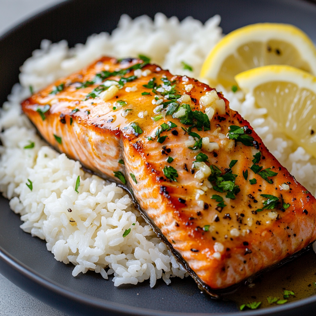 - Serve the salmon on a bed of fluffy rice, garnished with fresh parsley and a lemon wedge.