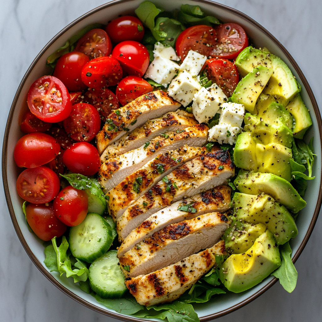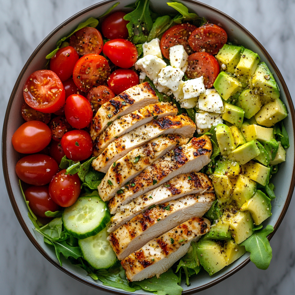 - In a mixing bowl, layer arugula (or mixed greens), cherry tomatoes, diced cucumber, crumbled feta cheese, and garlic croutons. Top it off with sliced avocado and grilled chicken.