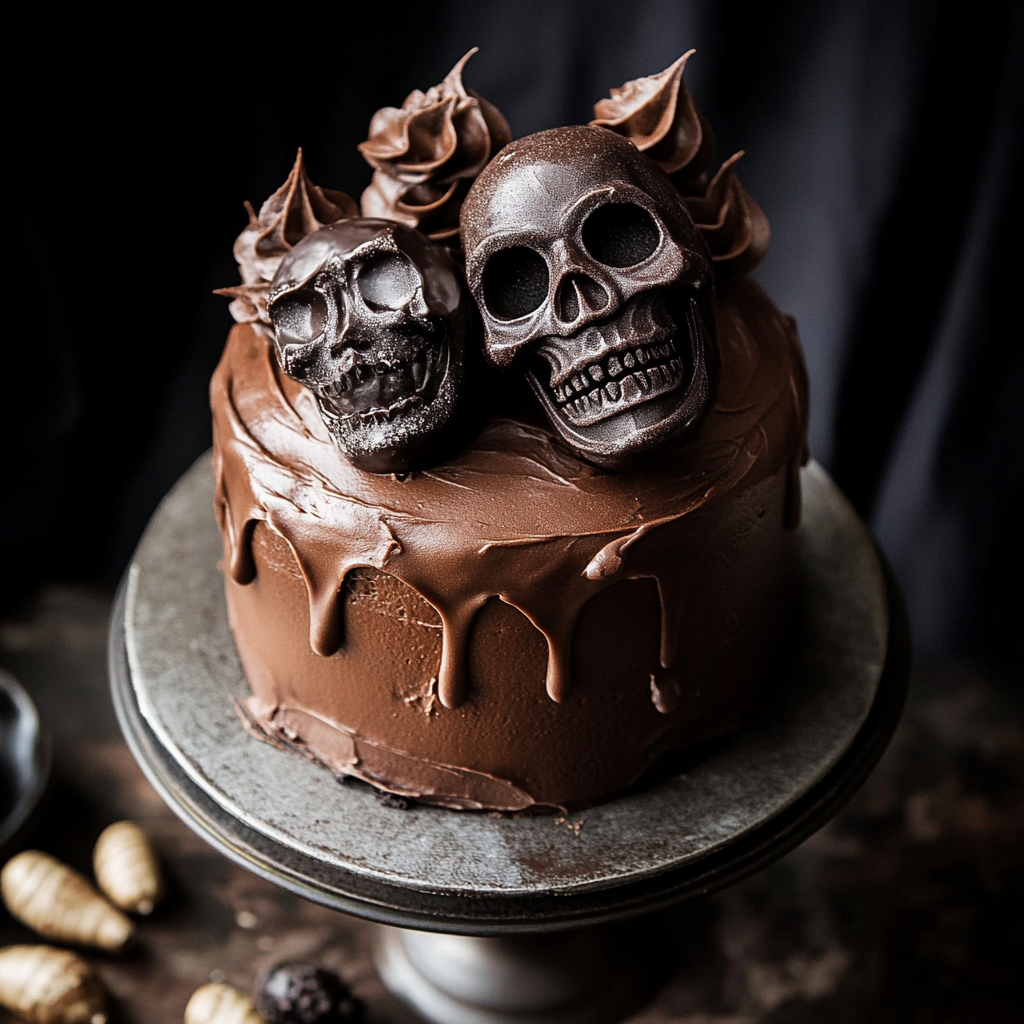 - Frost cooled cake layers generously and decorate with melted chocolate candy melts and mini chocolate skulls.