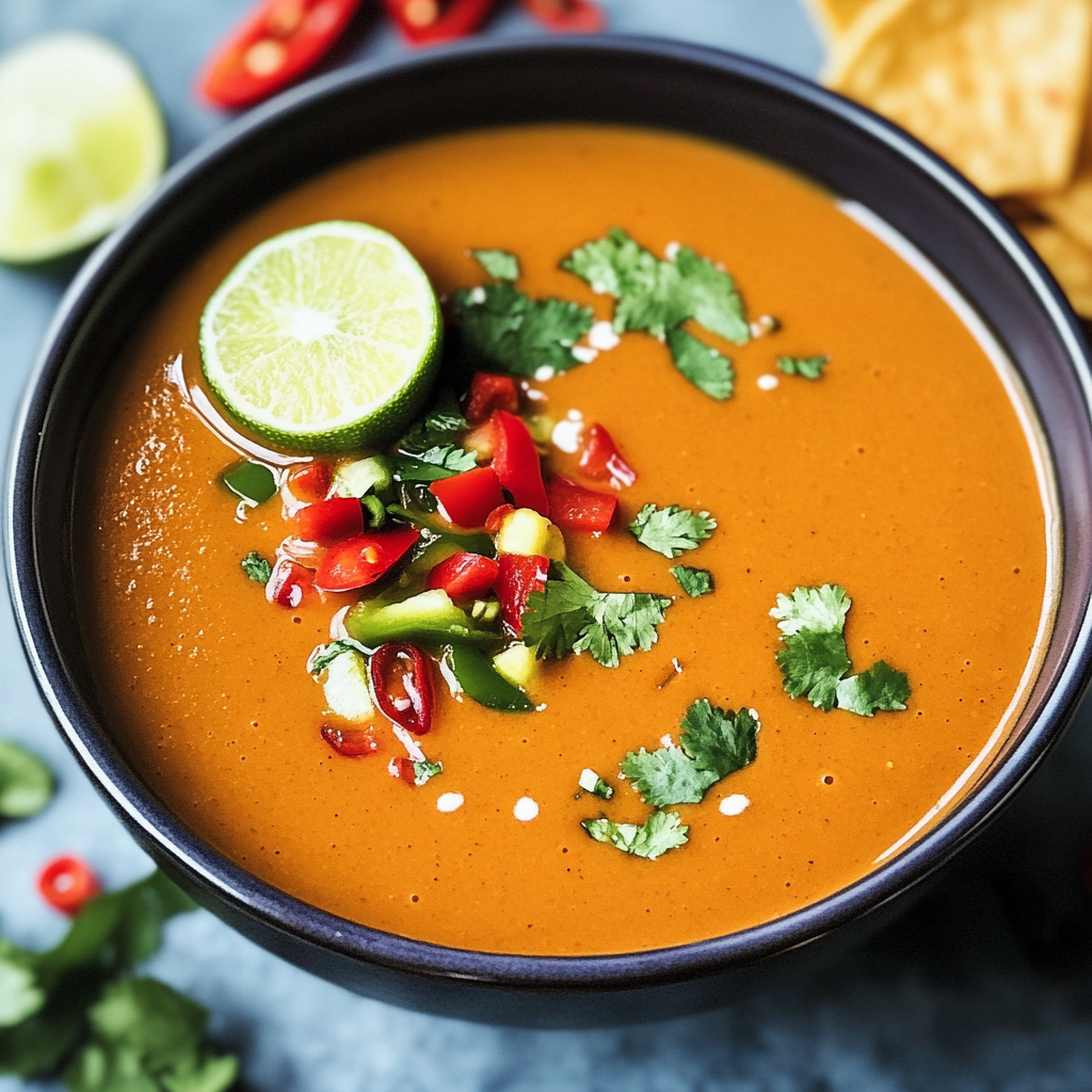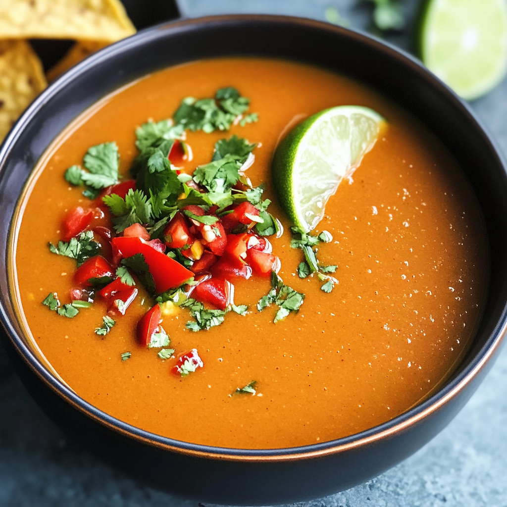 Indulge in a warm bowl of Mexican-Style Tomato Soup, a vibrant and flavorful dish that comes together in just 20 minutes. Infused with the zesty notes of chili peppers, roasted peppers, and aromatic spices, this soup is not only quick to prepare but also rich in nutrients, making it an ideal choice for busy weeknights or casual gatherings. Creamy coconut milk adds a delightful richness without any dairy, while fresh toppings like lime and crispy tortilla chips enhance every bite. Perfect as a main course or a side dish, this soup is sure to become a family favorite.