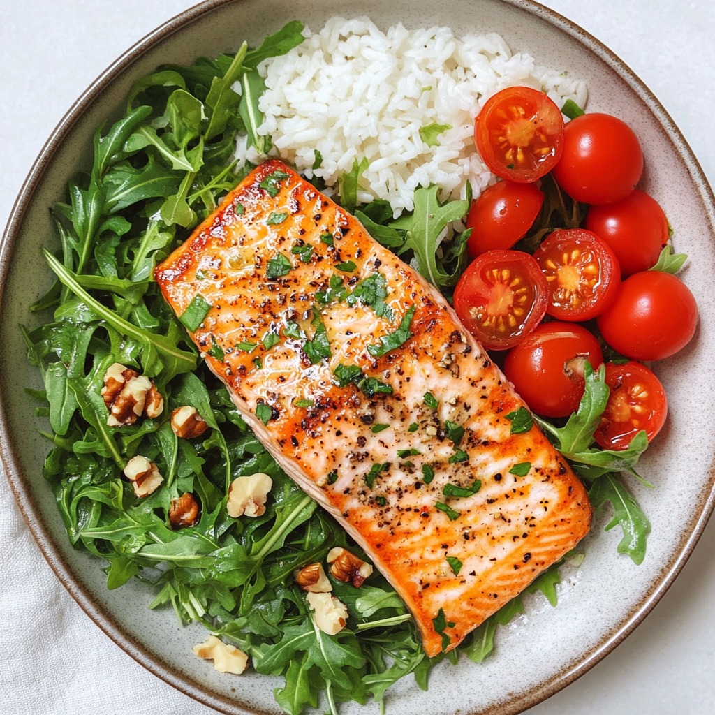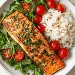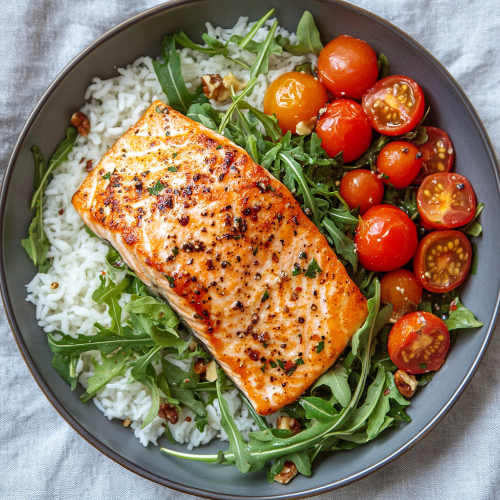 Seared Salmon with Rice & Arugula Tomato Salad is a delightful dish that brings together crispy salmon, fluffy rice, and a vibrant salad. This recipe is perfect for quick weeknight dinners or special occasions. Packed with flavor and nutrients, it’s a meal that satisfies the palate while being easy to prepare.