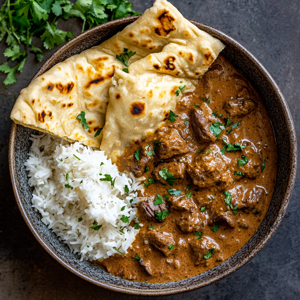 Slow-Cooked Beef in Creamy Coconut Curry with Rice and Garlic Naan